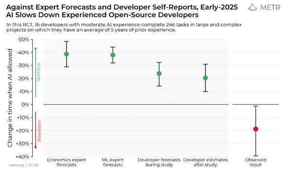 There is a big gap between what developers and experts expected the AI to help, and what the actual results were. They expected ~30% speedups, and in reality got ~20% SLOWDOWNS.