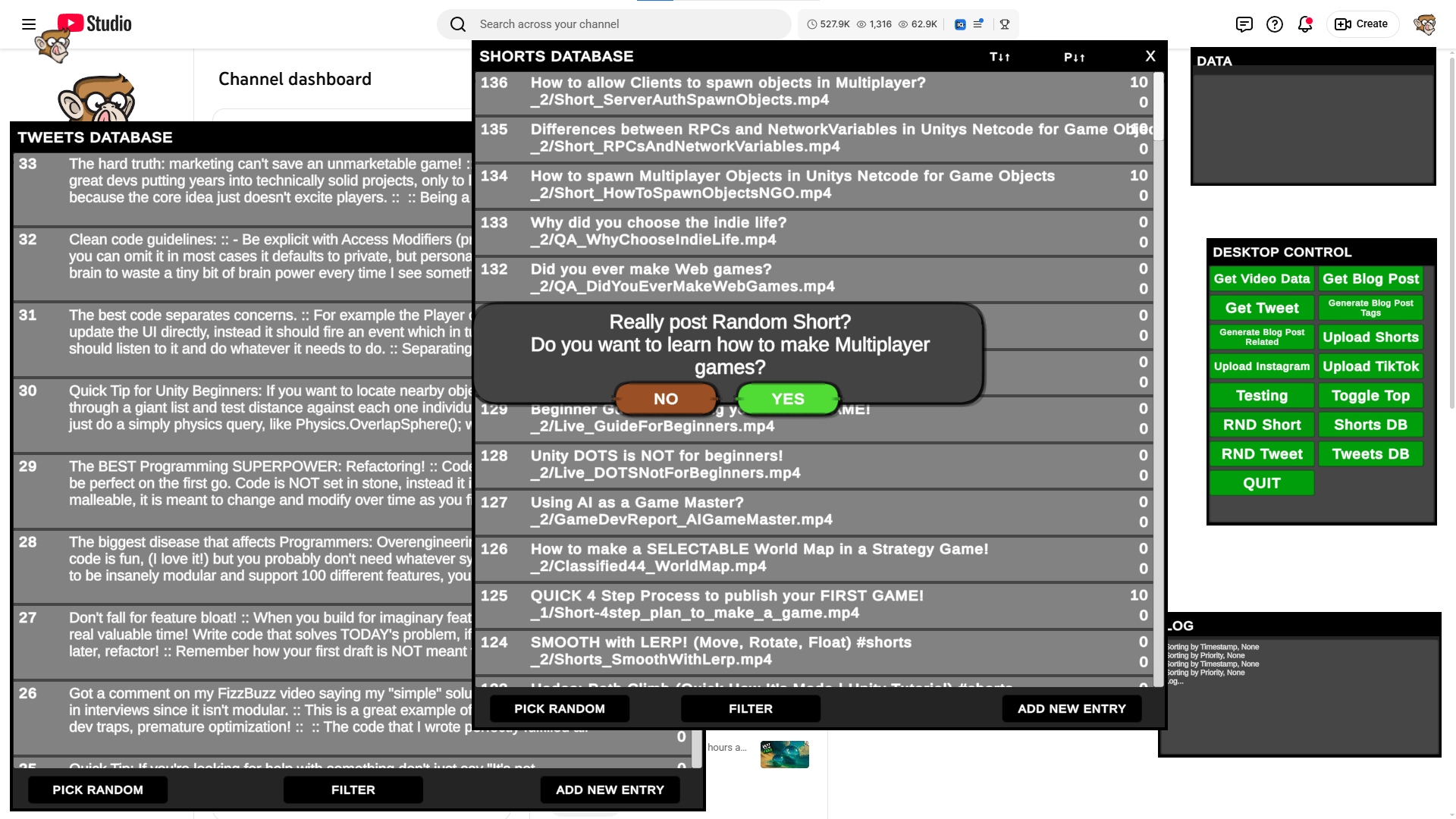 To make this work whilst not going insane with doing too much, I built a nice tool for myself to store a database of shorts/tweets and automated the process of posting them. Since those services don't all have APIs for uploading stuff I just used a tool that helps me get the Desktop inside Unity (tutorial) and then it manually moves the mouse to click buttons or go to textboxes and write some text. It's all automated!