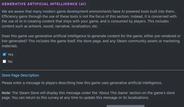 Steam has required developers to disclose whether they use AI or not for quite a while now. However there was always confusion as to what counts as AI. Is it just AI generated art? AI generated sound? AI localization? What about AI generated code? Or just AI code suggestions? Some developers get confused by this because nowadays if you use any modern IDE it will probably have AI features on by default, therefore technically every single game should say yes to this form.