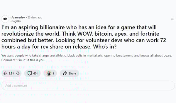 This is obvious satire but it's not uncommon to see these kinds of posts in a genuine manner, people saying "I have an awesome idea and if you build it for me I will give you a small %"